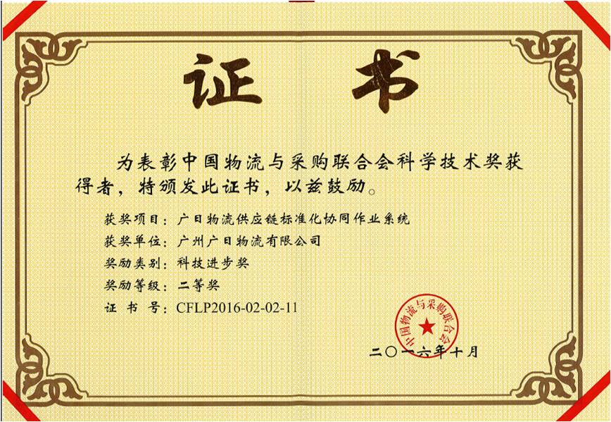 2016年10月,廣日物流憑借“廣日物流供應(yīng)鏈標(biāo)準(zhǔn)化協(xié)同作業(yè)系統(tǒng)”項(xiàng)目榮獲由中國物流與采購聯(lián)合會(huì)頒發(fā)的“2016年科技進(jìn)步獎(jiǎng)二等獎(jiǎng)”。中國物流與采購聯(lián)合會(huì)的科學(xué)技術(shù)獎(jiǎng)由國家科學(xué)技術(shù)獎(jiǎng)勵(lì)辦公室批準(zhǔn)設(shè)立,旨在獎(jiǎng)勵(lì)全國物流與采購以及生產(chǎn)資料流通領(lǐng)域中的技術(shù)發(fā)明與科學(xué)技術(shù)進(jìn)步成果。