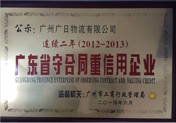 近日,廣日物流被廣州市工商行政管理局評選為連續兩年(2012-2013)“廣東省守合同重信用企業”。