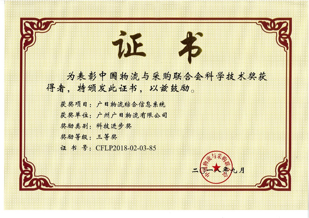 2018年9月27-29日,由中國物流與采購聯(lián)合會主辦的“第十一屆現(xiàn)代物流科技創(chuàng)新大會暨2018年度中國物流與采購聯(lián)合會科學(xué)技術(shù)獎頒獎大會”在重慶召開,廣日物流憑借 “廣日物流綜合信息系統(tǒng)” 榮膺中國物流與采購聯(lián)合會科技進(jìn)步獎三等獎,這也是廣日物流連續(xù)7年榮獲該獎項(xiàng)。