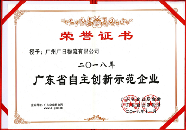 廣日物流榮獲“2018年度廣東省自主創(chuàng)新示范企業(yè)” 稱號