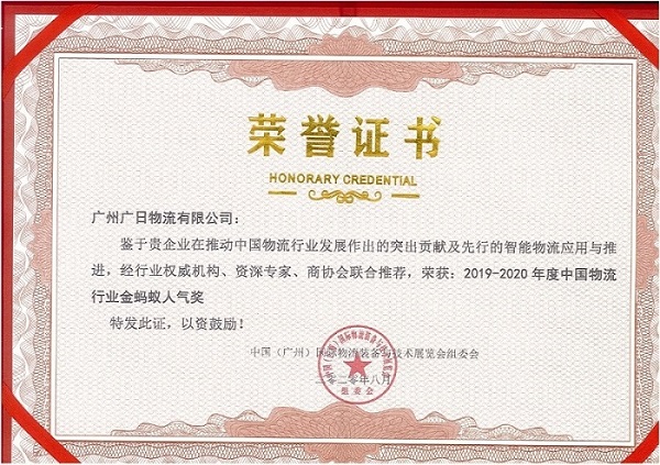 作為行業一大焦點盛會,“金螞蟻”頒獎盛典已成功舉辦四屆,每年一屆的“金螞蟻獎”旨在對各行業在物流(廠內物流、倉儲物流、供應鏈物流)與自動化領域提質增效的應用項目案例中作出卓越貢獻,引領行業發展趨勢的優秀企業頒發“金螞蟻”獎。廣州廣日物流有限公司憑借著這些年在物流領域做出的突出的貢獻,經行業權威機構、資深專家、商協會、行業的聯合推薦,榮獲2020年第五屆“中國物流行業金螞蟻人氣獎”。
